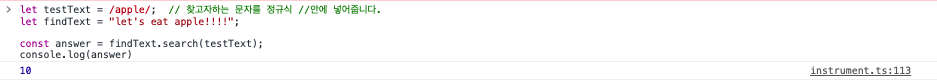 let testText = /apple/; // 찾고자하는 문자를 정규식 //안에 넣어줍니다.
