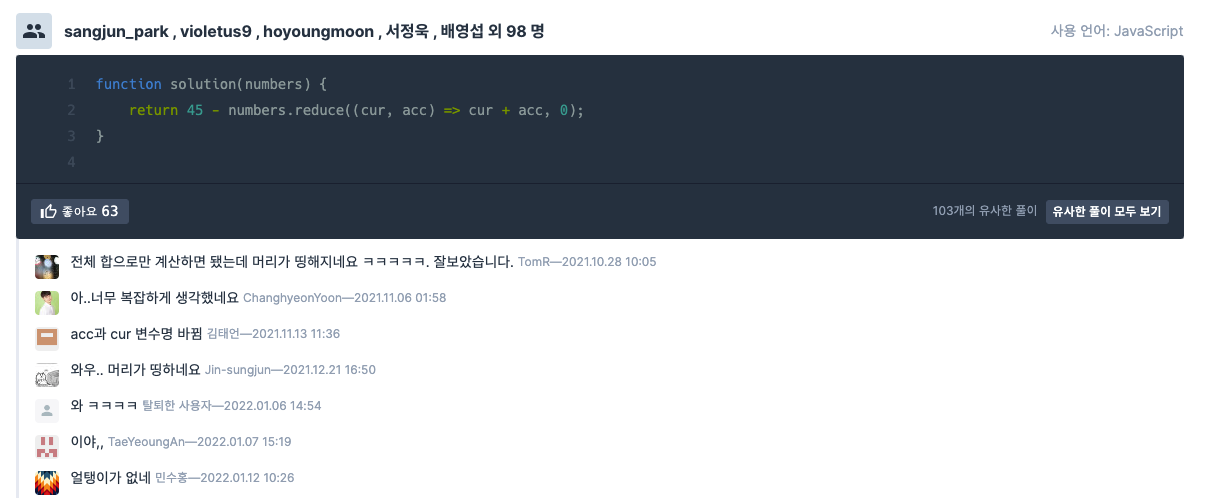 0-9까지의 전체 합에서 reduce 함수를 이용해서 가지고 있는 값들을 더한걸 빼주는 것으로 구했네욥..